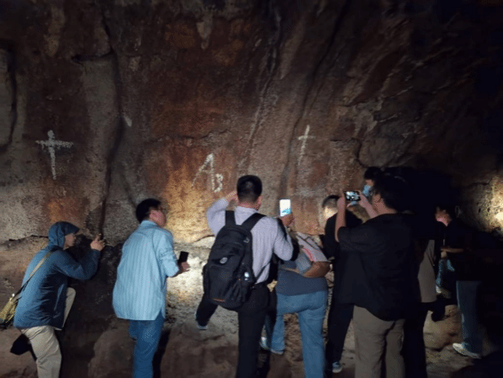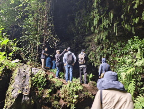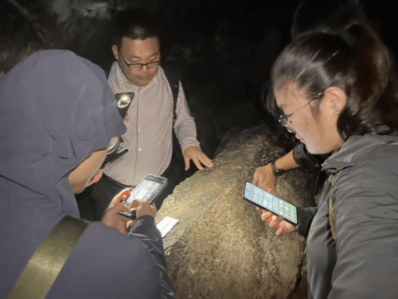 深入“仙人洞”熔岩隧道,幽暗深邃的环境营造出强烈的沉浸体验。马昌前教授打开手机灯光,指着洞顶和侧壁的熔岩滴瘤说:“这里曾是炽热岩浆流动的通道,我们此刻踏足的正是凝固的时间。”师生们惊叹于自然地质作用的鬼斧神工,并围绕隧道成因及其后期改造过程开展了热烈探讨。