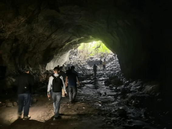 师生观察熔岩隧道中岩石特征