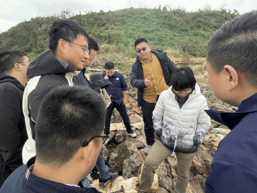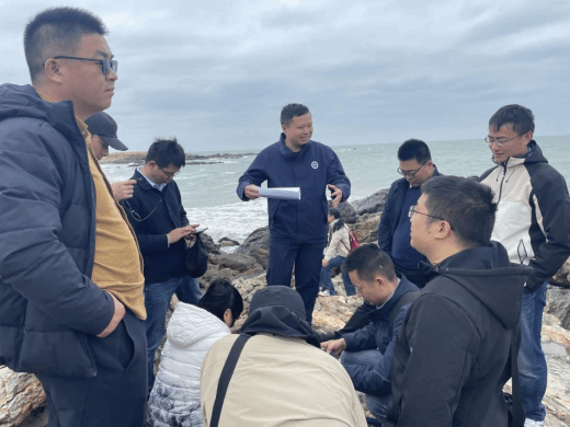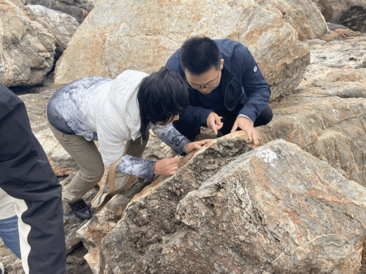 木兰湾的变质岩考察将“导学共研”推向高潮。在海风凛冽的基岩海岸,现场演变为一个开放的学术研讨平台。李益龙老师引导大家关注片麻理构造现象,刘嵘老师则从矿物组合的微观特征进行补充阐释。随行的地质局专家结合区域勘探实践经验,系统介绍了宏观地质背景和当前研究程度。师生与产业专家围绕“海南岛构造单元划分和演化”开展了深入讨论,不同学术观点在海浪拍岸声中激烈交锋,地学知识在共享与互动中得以有效建构与深度内化。